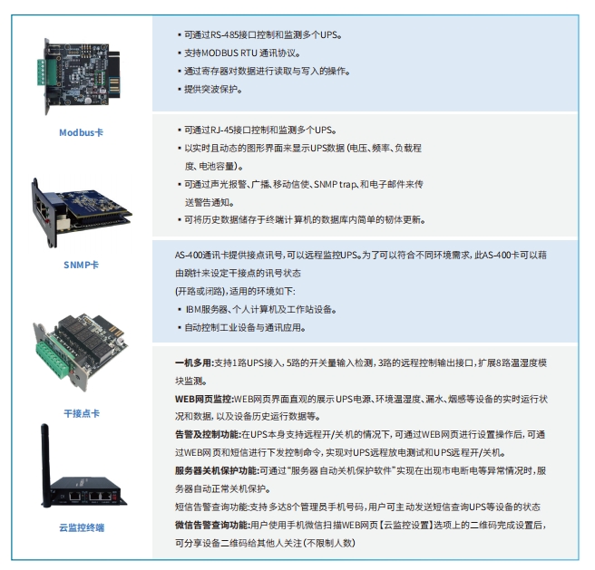 提供多种监控卡及终端供用户选择,实现对UPS不间断电源的选程监控及管理